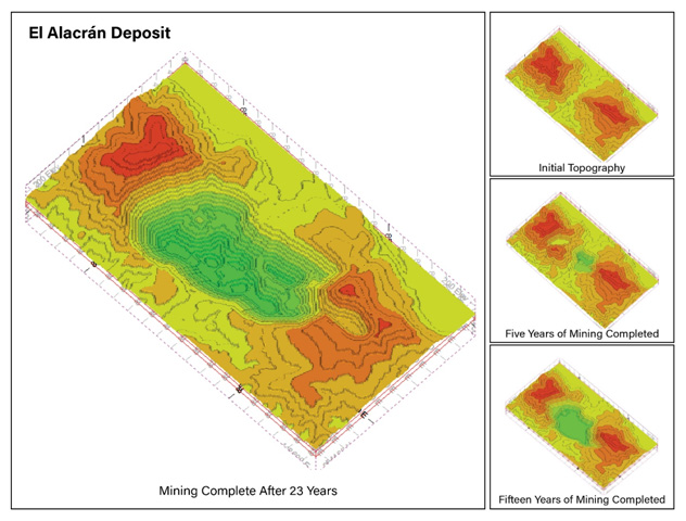 In the PEA, mining activity at the Alacran pit is projected to be reduced in Year 17, at which point part of the mining fleet is planned to start mining the satellite deposits at the Montiel East, Montiel West and Costa Azul pits. The PEA assumes that these smaller, satellite open pits will be mined simultaneously in order to provide a sustainable supply of mill feed and increase operational flexibility. During Years 17 to 23, 8,000 tpd of mill feed is expected from the Alacran pit complemented by 8,000 tpd from the satellite pits.