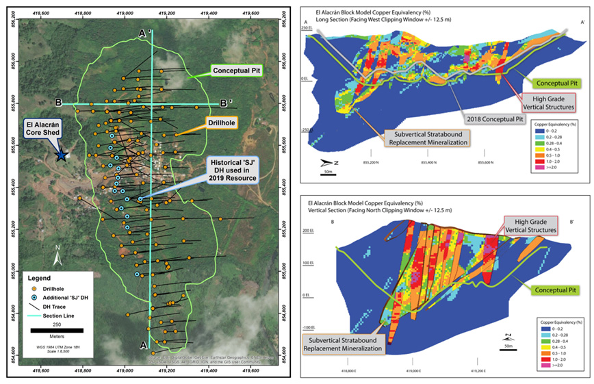 Figure 3: Plan map of Alacran deposit with drill holes plotted (LHS), Alacran block model sections “A” and “B” showing CuEq grades with high-grade vertical structures (RHS).
