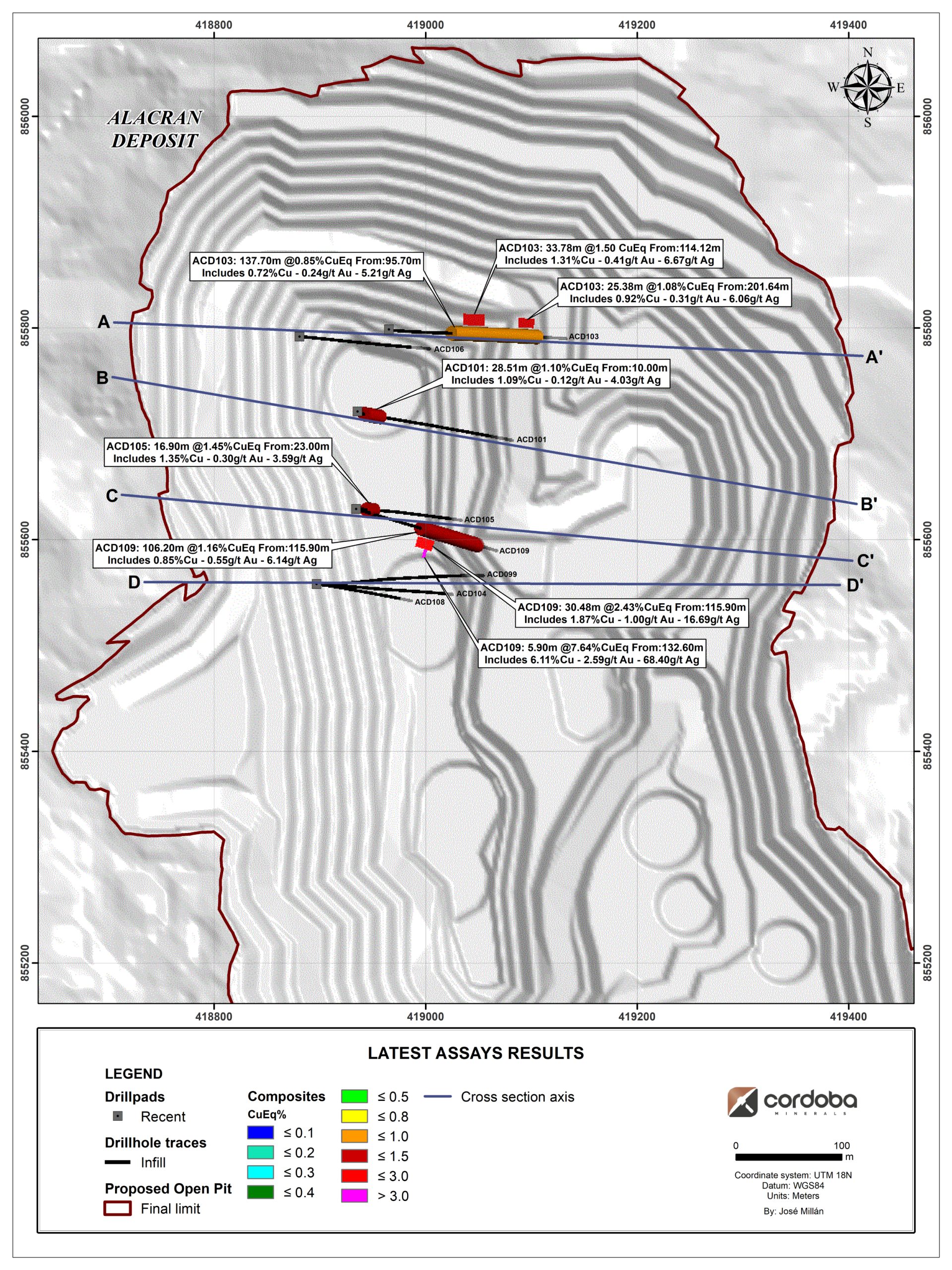 “We are incredibly encouraged by these positive results from the infill drill holes which support the higher grade domains in our resource model for the Alacran Deposit. The northern and central areas that we are drilling for the current campaign host multiple high-grade mineralized zones and we look forward to the results of the remaining campaign.” commented Ms. Armstrong-Montoya, President and CEO of Cordoba. “These drilling areas are located in close proximity with numerous local communities. We appreciate their trust and support on our campaign and we are dedicated to maintain the collaborative relationship we shared.”