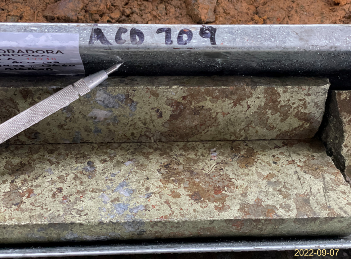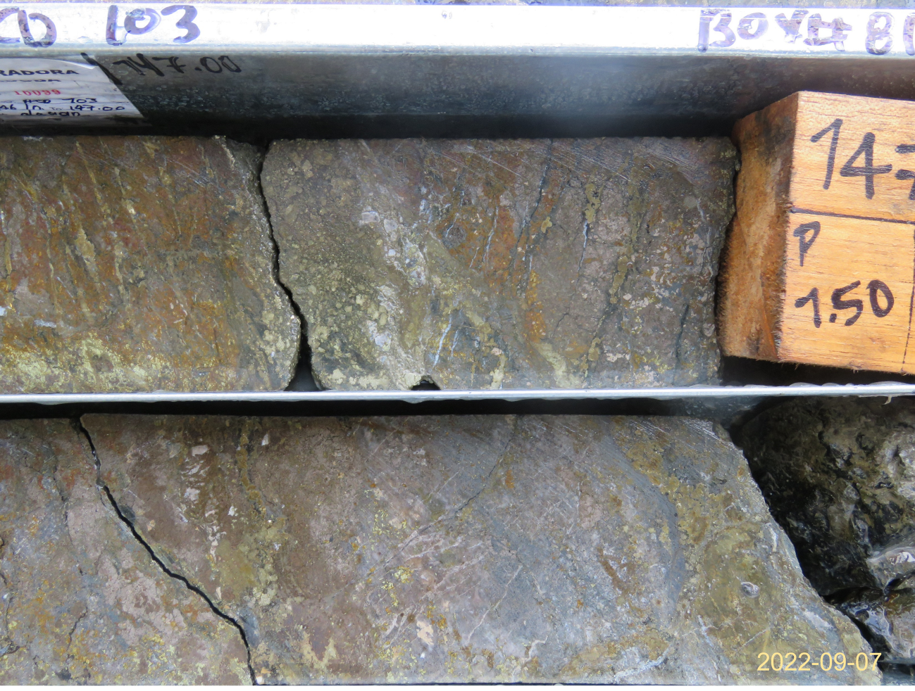 Figure 10: Semi-massive chalcopyrite and pyrite within ‘Unit 2’ carbonaceous mudstones at 147 m below collar in hole ACD103. This sample returned 7.98% Cu, 1.995 g/t Au and 42.6 g/t Ag for 8.85% CuEq1 and is at the base of a 33.78 m higher grade zone between 114.12 m and 147.90 m below collar which returned 1.31% Cu, 0.41 g/t Au and 6.77g/t Ag or 1.50% CuEq1.