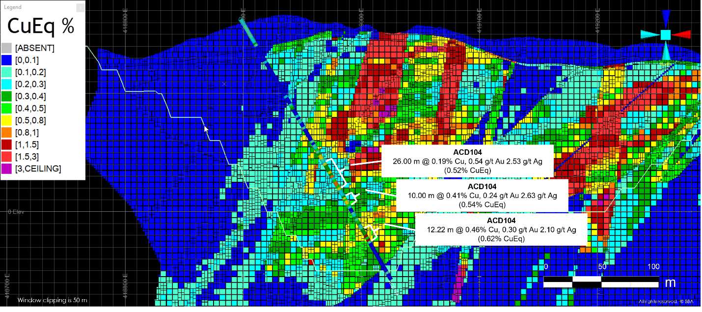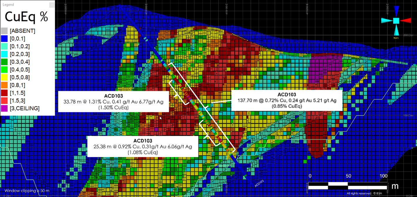 - ACD103 – 137.7 m with 0.72% Cu, 0.24 g/t Au and 5.21 g/t Ag or 0.85% CuEq1, including: