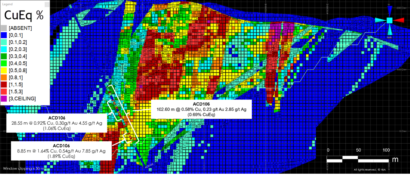 - ACD109– 106.2 metres (“m”) with 0.85% copper (“Cu”), 0.55 g/t gold (“Au”) and 6.14 g/t silver (“Ag”) or 1.16% copper equivalent1 (“CuEq”), including: